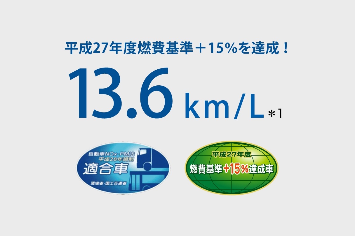 ■重量車モード燃費値は法令に基づく標準的な諸元値および条件を用いてエンジン燃費を実測し、シミュレーション法で算出した国土交通省審査値です。なお、実際の走行時にはその走り方や条件(気象、道路、車両、運転、架装ボディ、整備等の状況)が異なってきますので、それに応じて燃費は異なります。